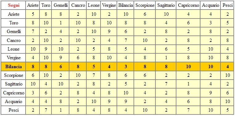 BILANCIA - TABELLA DELLE COMPATIBILITÀ ASTROLOGICHE