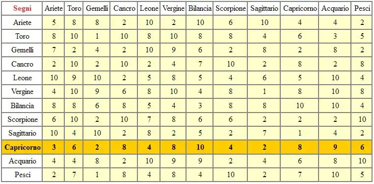CAPRICORNO - TABELLA DELLE COMPATIBILITÀ ASTROLOGICHE