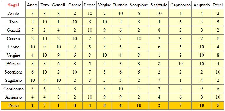 La tabella che trovate qui sotto è stata calcolata tenendo ovviamente presente la compatibilità soltanto tra segni solari. Il punteggio per ogni coppia va da un minimo di 1 ad un massimo di 10. Ad esempio se tra due segni trovate un valore 1 allora questo vuol dire che tra di loro vi è una bassissima probabilità di andare d'accordo in diversi settori e quindi nel lavoro, in amore ed anche a livello intimo. Tenete conto che è una tabella generica e che quindi una vera affinità e compatibilità tra due persone si può solo calcolare attraverso una sinastria e cioè attraverso lo studio approfondito dei temi natali delle due persone coinvolte. Ma questa tabella è un buon punto di partenza e vedrete che vi ritroverete molto in essa. Troverete dei punteggi anche diversi quando andate ad incrociare un segno preso dalla colonna con un segno presto dalla riga. Ad esempio se cercate l'affinità tra Ariete e Gemelli e il primo segno lo prendete dalla colonna di sinistra mentre il segno dalla riga in alto, leggerete un punteggio di 8 mentre se fate il contrario e quindi Gemelli e Ariete troverete il punteggio di 7. Questo perchè nella colonna sono presenti i segni solari degli uomini mentre nella riga i segni solari delle donne. Quindi in riferimento all'esempio, la prima configurazione riguarda un uomo Ariete e una donna Gemelli, mentre la seconda configurazione riguarda invece un uomo Gemelli e una donna Ariete. Ecco il perchè di alcuni punteggi diversi, in questo caso prima 8 e poi 7. L'uomo Ariete è leggermente diverso dalla donna Ariete e così per i Gemelli e gli altri segni rimanenti.