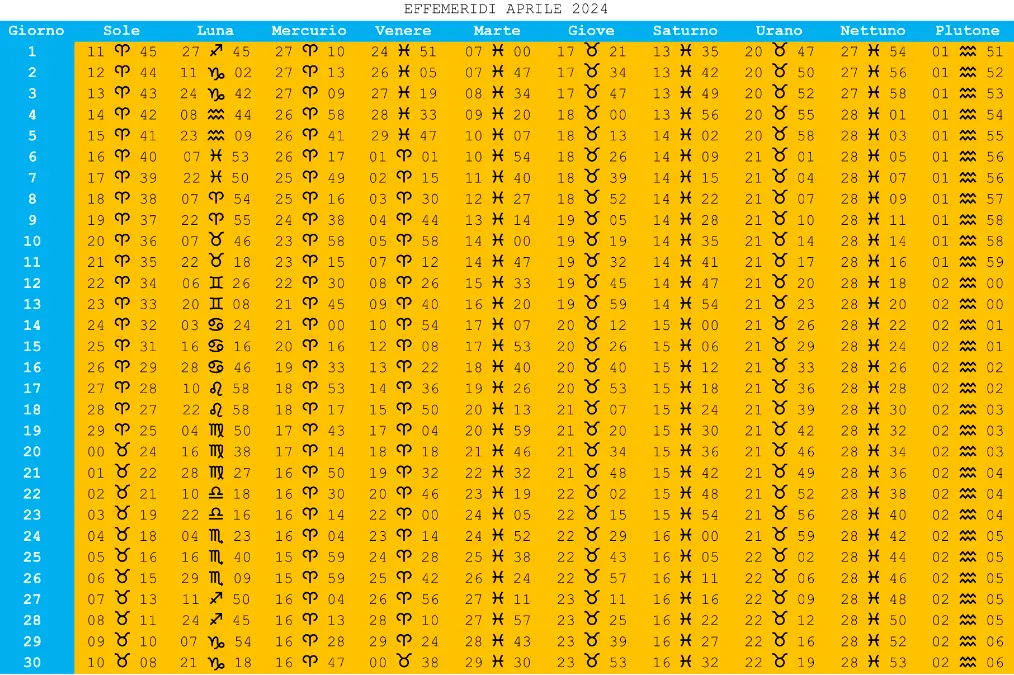 TABELLA EFFEMERIDI MESE APRILE 2024