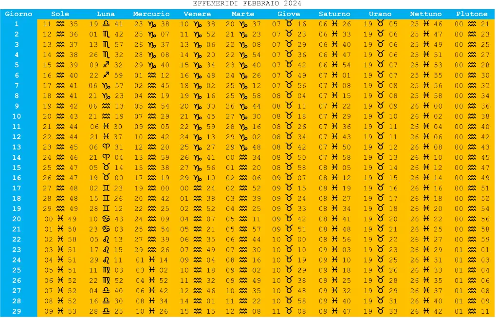 TABELLA EFFEMERIDI MESE FEBBRAIO 2024