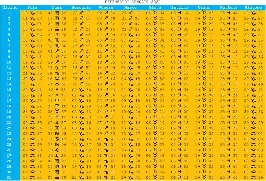 TABELLA EFFEMERIDI MESE GENNAIO 2024