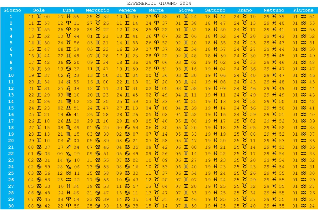 TABELLA EFFEMERIDI MESE GIUGNO 2024
